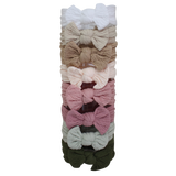 Comfortable textured fabric headbands with oversized bows in soft neutral and pastel shades. A mom favorite for keeping baby stylish and comfy.