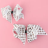 Our Big (5 in.) grosgrain bow in an exclusive hand drawn heart print on a clip. The various skin-tone shades in this bow represent the diverse and wonderful people in this country. Help your little girl celebrate love and diversity with this bow which are at the very core of the Bows Arts mission.