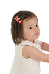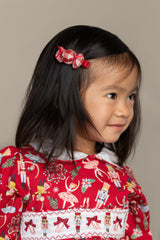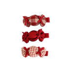 Candy-shaped fabric bow clips in mixed textures like plaid and velvet. Sweet, secure, and made for holiday outfits.